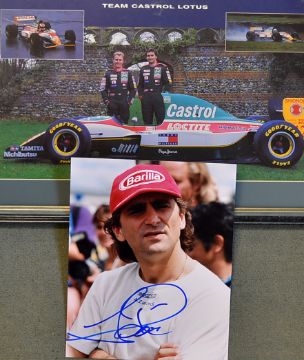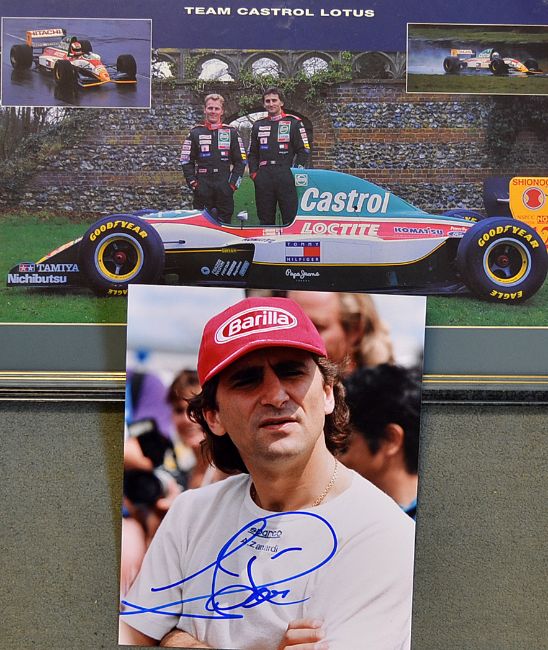 Signed Alex Zanardi photograph in colour t/w a Johnny Herbert and Alex Zanardi Formula One racing photograph print mf&g 20” x 13” both in VG condition (2)