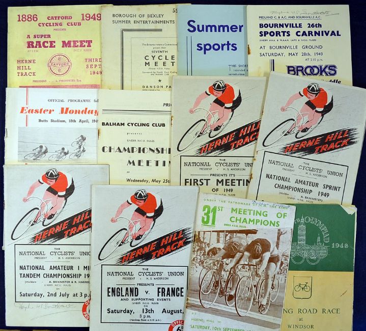Various 1948/49 Cycling racing programmes to incl ’48 Olympics - mainly at Herne Hill to include NCU First Meeting of 1949 07/05/49, National Amateur Sprint Championship 11/06/49, National Amateur 1 Mile Tandem Championship 02/07/49, England v France 13/08/49, 31st Meeting of Champions 10/09/49, London XIVth Olympiad Cycling Road Race at Windsor 13/08/1948, other clubs include Balham CC, Coventry CC, Bournville AC, Bexley, Catford CC and British League of Racing Cyclists, in varying condition A/G (13)