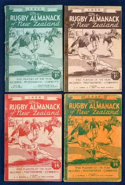 Near Complete Run of New Zealand Rugby Almanacks from 1st ed 1935 – 1978. 4x Scarce Pre War New Zealand Rugby Almanacks from 1935 to 1939 – to incl the 1st ed (missing 3rd ed) – all with pictorial wrappers featuring “Five Players of the Year, Records, Photographs and Comments” – evidence of staple rust, some wear to spine and some discolouration to the covers – internally clean hence (F/G) Note: The NZ Almanack is the longest running rugby annual in the world