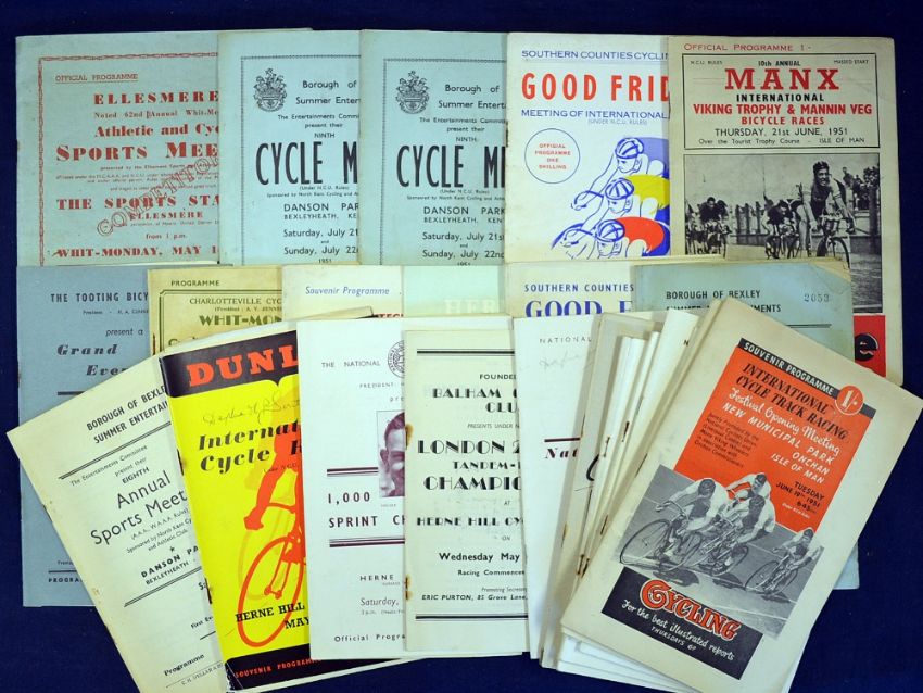 Assorted selection of 1950/51 International and Club Cycling programmes mainly at Herne Hill, consisting of International Cycle Track Racing at the Isle of Man 19/06/51, NCU First Meeting of 1950 06/05/50 at Herne Hill, NCU 1000 Yards Sprint Championship 07/07/51, 33rd Meeting of Championships08/09/51, NCU National 1 Mile Tandem Championship 16/06/51, England v France and Inter Services Challenge Trophy 18/08/51, Manx International Viking Trophy & Mannin Veg races 21/06/51 and others in varying conditions A/G (24)