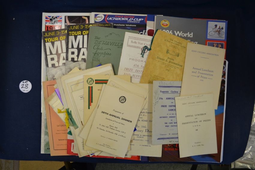 Large collection of Cycling racing ephemera from the 1940s’ onwards to incl Dinner menus, programmes, photographs and magazines consisting of Herne Hill Supporters club 1st and 2nd Annual Dinner Dance menus 1948-49, Belle Vue CC 36th Annual Dinner menu 05/12/1936, Kent Cycling Association Dinner menu 1935 – 36, 1945 Official Souvenir of the Opening of the National Cyclists’ Union track at Herne Hill, Belle Vue CC Second Wartime Dinner 05/01/1945, The Fountain CC Silver Anniversary Dinner meu 01/01/1955, 1989 British National Track Championships 28/07/1989 large format programme, and many more items to ‘wheelie’ interest you, worth inspecting, 1 box (110+)