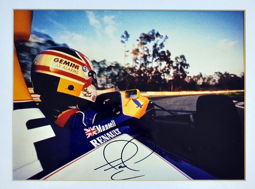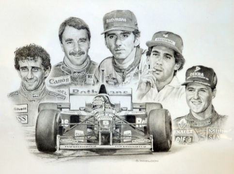 Signed Nigel Mansell Formula One World Champion photograph for Williams, a colour action shot mf&g 20” x 18”, t/w Pencil print montage of Senna, Mansell, M. Schumacher and Hill, by S Wheldon mf&g size 20” x 18” (2)