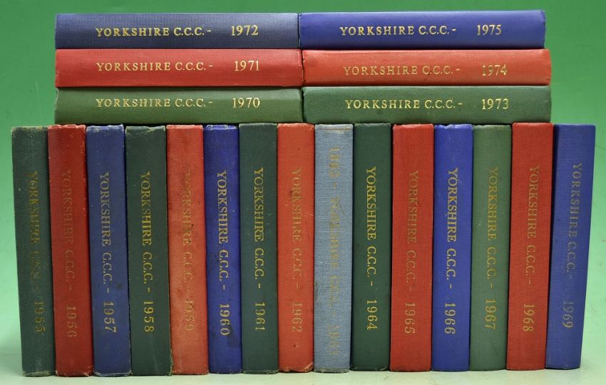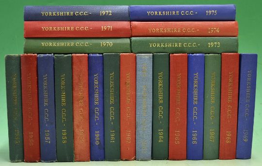 Collection Yorkshire County Cricket Club Yearbooks from 1955 to 1975 – original pictorial cloth and gilt boards, some faded and with wear otherwise overall clean, a great collection (21)