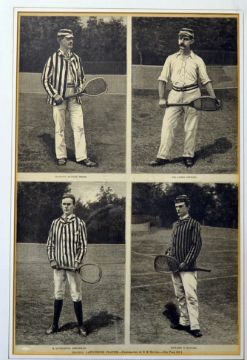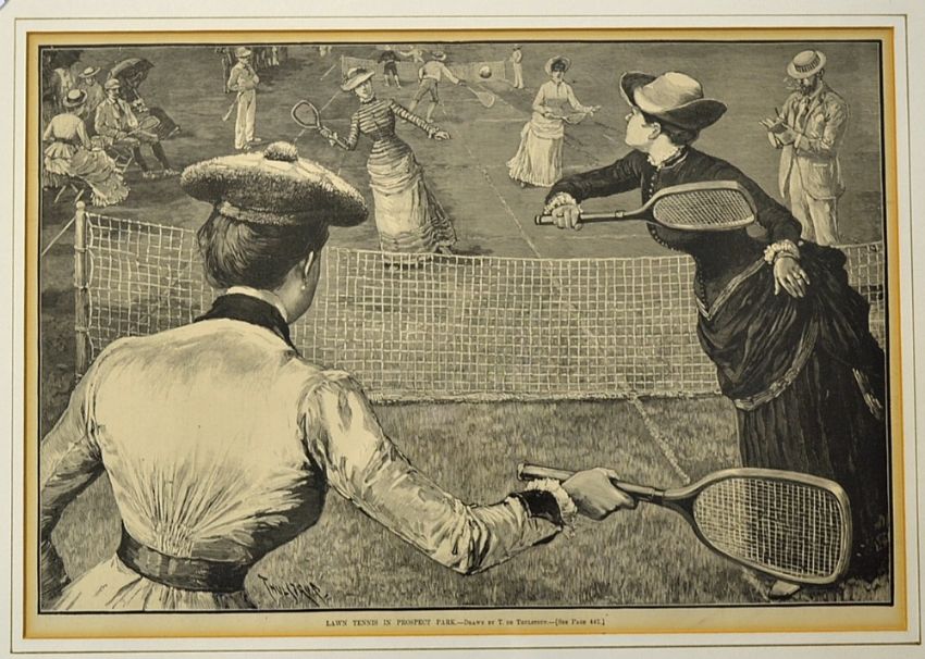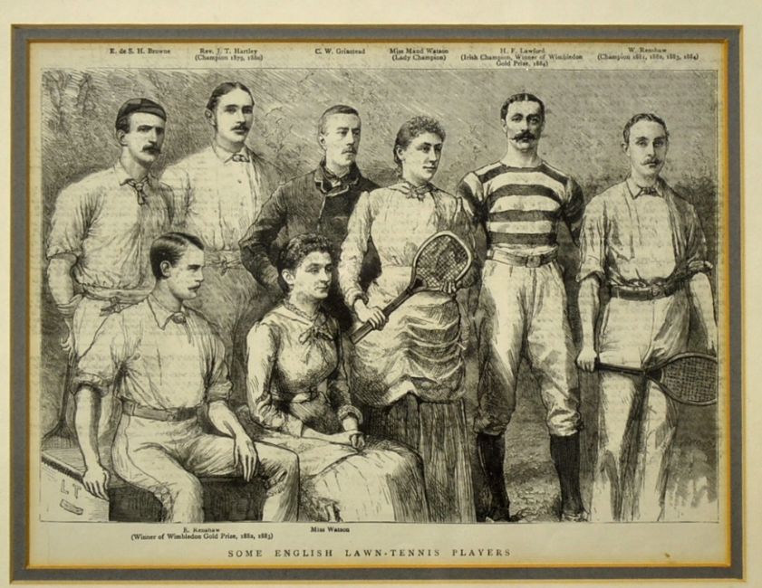 3x early monochrome tennis prints from the 1880s to incl a)“Leading Lawn-Tennis Players-photographed by EM Bidwell” to include Richard Dudley Sears, Dr James Dwight, R Livingston Beeckman and Howard A Taylor, b) “Lawn Tennis in Prospect Park-drawn by T De Thulstrup” depicting a ladies doubles match playing with flat top rackets - both mounted and in matching walnut frames both measuring 20 x 15.75” (one portrait and one landscape) together with “Some English Lawn-Tennis Players” depicting mostly tennis champions including E. Renshaw, Miss Maud Watson, W Renshaw, H.F Lawford, Rev J T Hartley et al. mf&g overall 12.75” x 15.25”