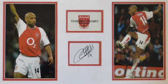 Arsenal legend Thierry Henry autographed montage including 2x 2003 action shot colour prints and an autograph, mf&g overall 25 x 14”