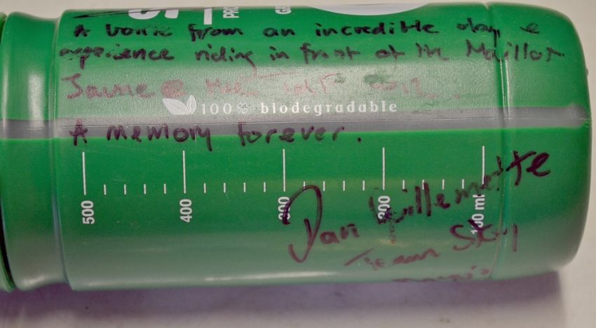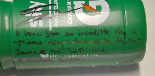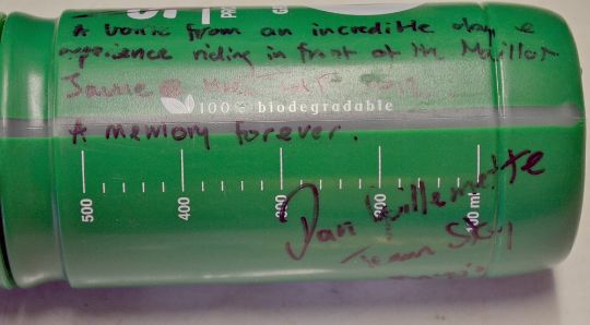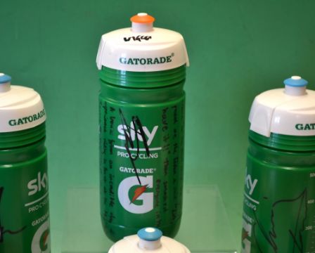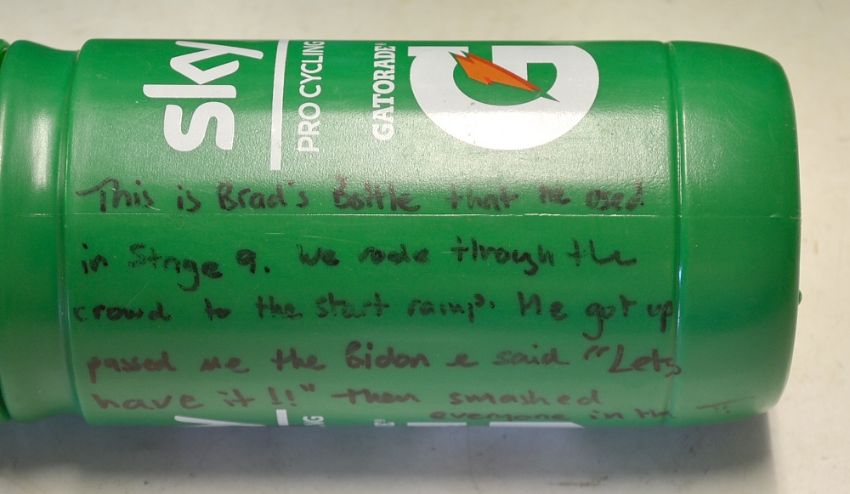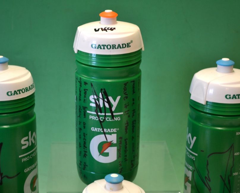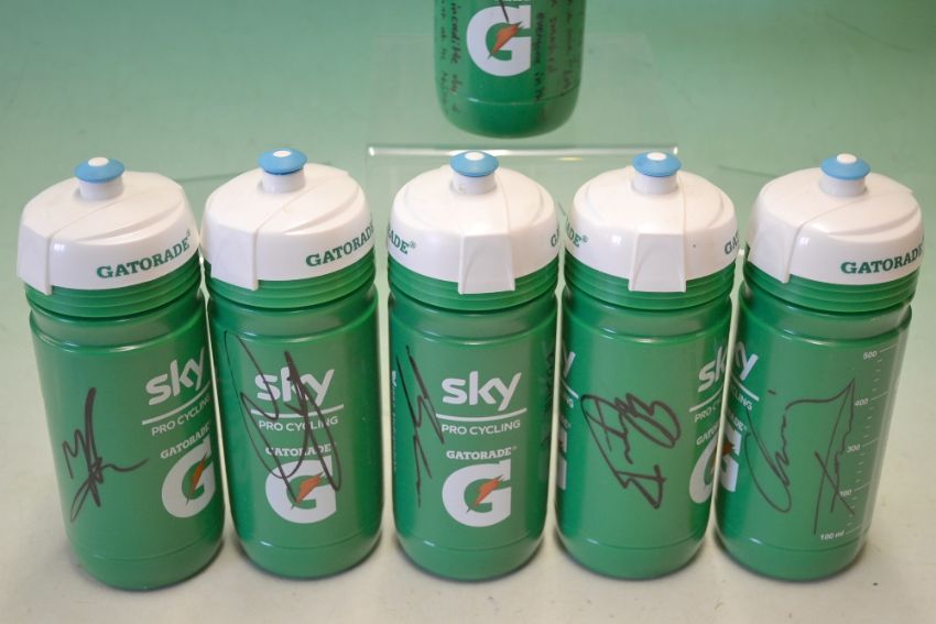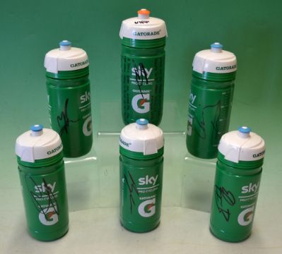 Bradley Wiggins – Winner of 2012 Tour De France. 2012 Tour De France Champion Bradley Wiggins and Sky Team signed water bottles - to incl 2x used by Bradley Wiggins in Tour De France with writing in ink which describes ‘This is Brad’s bottle that he used in stage 9. We rode through the crowd to the start ramp. He got up, passed me the bidon and said “Let’s have it”, then smashed everyone’ signed by Bradley Wiggins and Dan Guillemette (Sky team Physio). This bottle has an Orange top compared to the others which have a blue top. The remaining bottles include ‘Stage 20 Brad Wiggins’ signed, ‘Stage 16 Chris Froome’ signed, ‘Stage 16 Edvald Boasson Hagen’ signed, ‘Stage 16 Richie Porte’ signed and ‘Stage 17 Michael Rogers’ signed, all autographs are clear, however some have slight fading, the bottles are in G condition (6) Note: Sky dominated the Tour De France general classification with Wiggins first and Froome second overall. Images of Bradley Wiggins riding the Pinerecco Bicycle with an Orange bottle top will be included