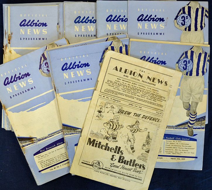 Collection of West Bromwich Albion home football programmes including 1954/55 (2), 1955/56 (4), 1956/57 (2), 1957/58 (6), 1958/59 (7), 1959/60 (10), 1960/61 (3), plus one from the 1940s (35) Condition varies