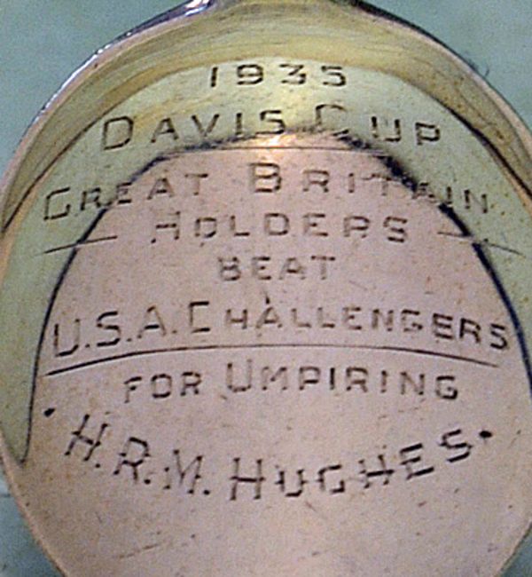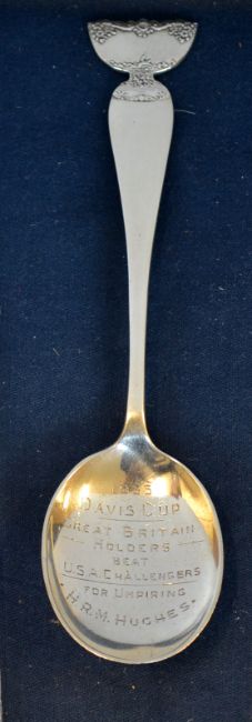 1935 Davies Cup International Lawn Tennis Championship Final Silver Spoon. Rare 1935 Davies Cup Final silver spoon and ephemera – silver hallmarked Birmingham 1935 - featuring Davis Cup finial and engraved to the bowl “1935 Davies Cup - Great Britain Holders beat USA Challengers - For Umpiring- HRM Hughes” overall 6” (154mm) together with rare 1935 Davies Cup International Lawn Tennis Championship “Completed” Final Programme with Great Britain winning by 5-0. The programme contains all the results, player profiles and previous results and qualifying rounds to the rear. Comes together with the original press photograph of the Great Britain team with the Davis Cup featuring Fred Perry, Bunny Austin, Roper Barrett (non-playing team captain) GP Hughes, and CD Tuckey - overall 8”x 11.25” # (3)