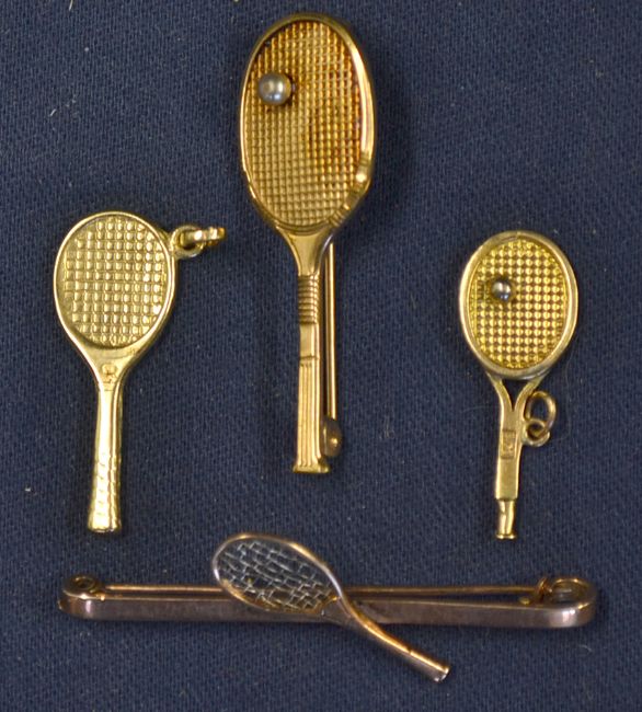 Ladies gold tennis bar brooch – stamped 9ct and mounted with a tilted head racket together with 2x small tennis racket lucky charms/pendants one stamped 9ct and a rolled gold tennis racket bar brooch (4)