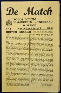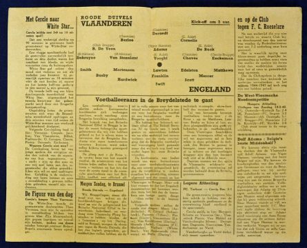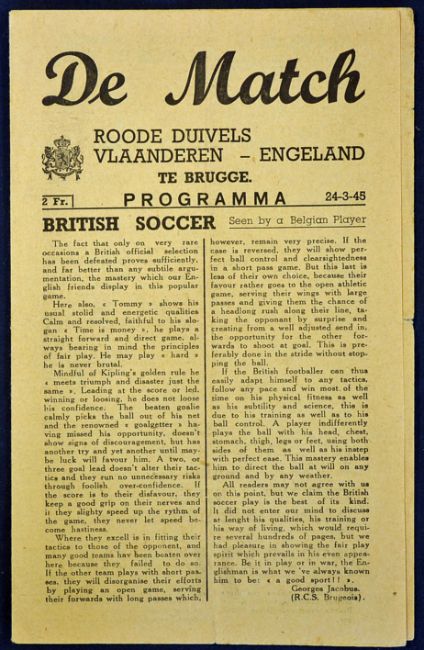 Very scarce war-time international match programme Red Devil’s Vlaanderen v England dated 24 March 1945 in Brugge; England team had Swift, Mercer, Franklin, Matthews, Lawton, Mortensen etc. in the team line-up. 4 pager, folds, no writing and good for the year