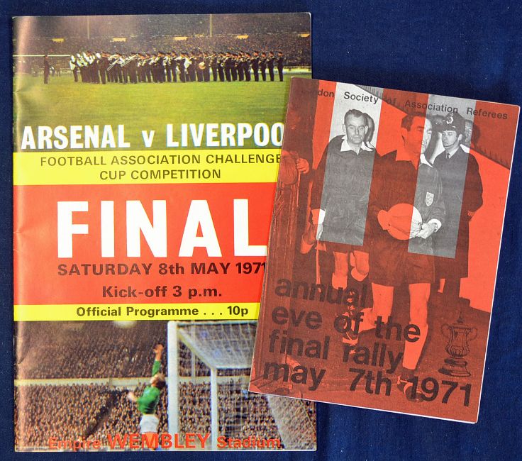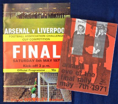 1971 FA Cup Final football programme Arsenal (double season) v Liverpool plus Eve of the Final Rally programme hand signed by the referee and linesmen (2) Programme has writing, plus newspaper match report Eve of the Final Rally programme is in very good condition.