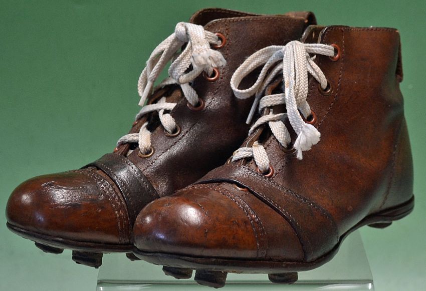 Pair of brown leather football boots, late 1940 early 1950s vintage, child size, polished and in VG condition
