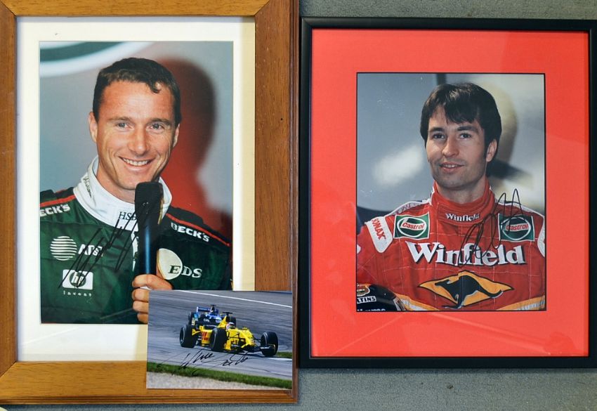 Selection of signed Formula One racing photographs featuring Heinz Frentzen Williams, size 14” x 12”, Takumo Sato BAR size 12” x 10” plus smaller signed photograph, Eddie Irvine Jaguar F1G0005, 17” x 13” and Rene Arnoux Renault winner of the French GP ‘82, size 14” x 12”, all colour and all but 1x mf&g and all in VG condition (5)