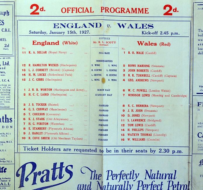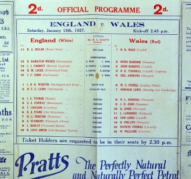 1927 England v Wales rugby programme - played on January 15th - large single sheet programme with England winning 11-9, usual pocket folds and some wear otherwise overall (F/G)