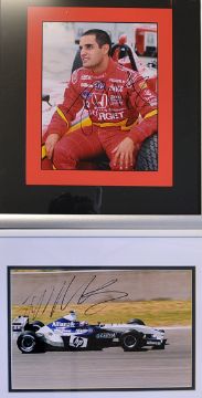 Signed Juan Pablo Montoya Formula One racing photographs in BMW Williams racing action shot and another posed shot Honda Indy Car, both mf&g sizes 17” x 15” and 17” x 14”, both in VG condition (2)