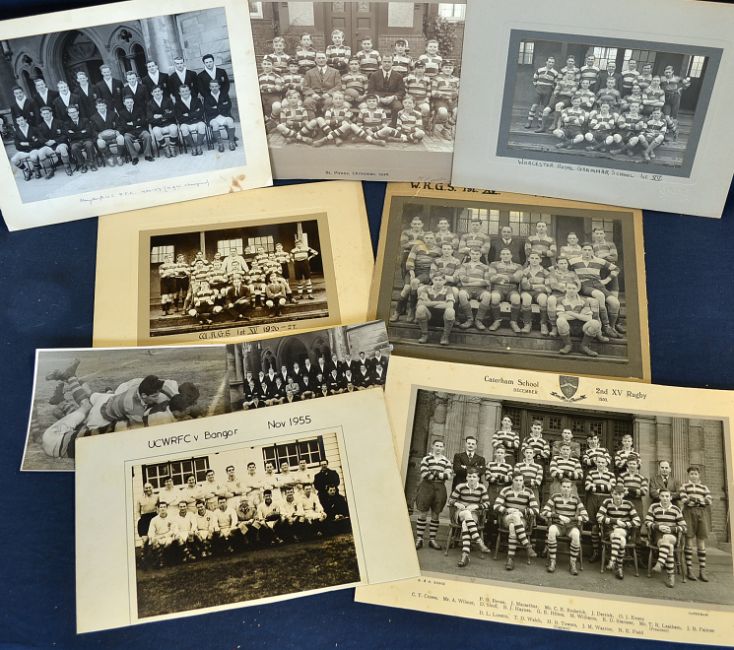 Interesting selection of c.1920s School rugby team photographs including 3x Worcester Royal Grammar School 1st XV1927 and 1930, St. Pirans, Christmas 1926, Aberystwyth UCRFC 1957, UCWRFC v Bangor Nov 1955 and Caterham School 2nd XV Rugby 1950 most mounted and appear original (9)
