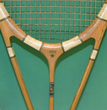 Fine and scarce Hazells Streamline Green Star tennis racket, c/w green whipping, green makers decal, fitted with the original leather grip and makers “H” butt cap - all original together with a Murray and Baldwin wooden racket press hence overall (G)