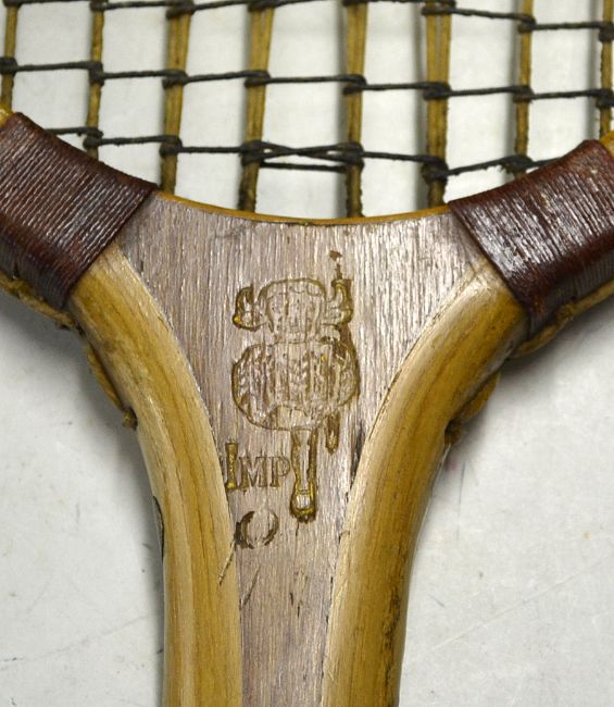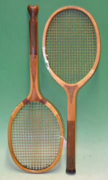 Fine and scarce “British Manufacture A Star” The Imp wooden fish tail tennis racket - the handle stamped Harold C Beck Russell Street, concave wedge complete with the original red and plain quadruple double centre mains stringing, 2 deep grooves to the handle overall (G) plus a similar good Slazenger ‘The Demon’ wooden tennis racket with a regular handle, a concave wedge to the throat c/w leather butt cap and collar (G) (2)