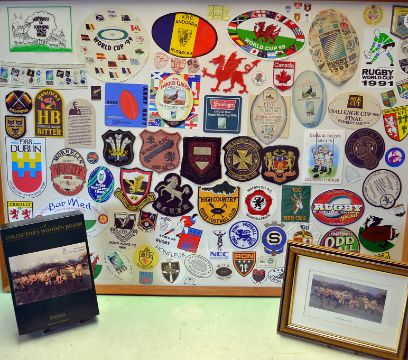 Mixed selection of rugby related embroidered badges, stickers, beer mats, and other ephemera/souvenir items, including Wales, Langholm, Canada, school related badges and more - mf&g overall 1m x 72cm (50+)