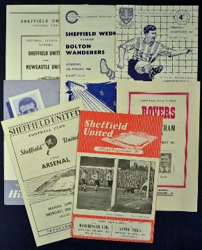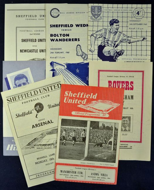 Football programme selection 53/54 Sheffield United v Aston Villa/Manchester Utd (double issue), 54/55 Sheffield Utd v Chelsea (Champions), v Arsenal (4 page), 54/55 Doncaster Rovers v Birmingham City (Championship decider match), 60/61 Bradford Park Avenue v Accrington Stanley (December-postponed) plus others F-G (10)