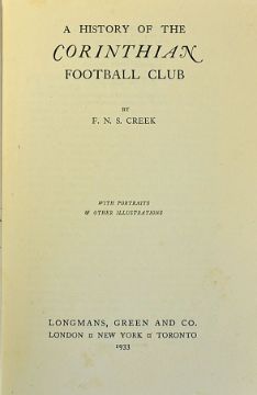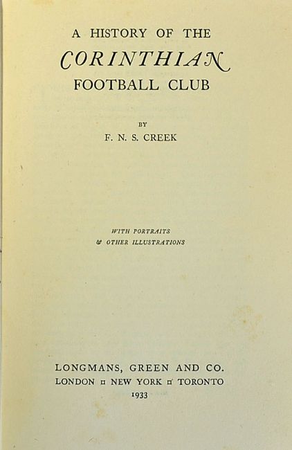 Interesting 1933 History of the Corinthians Football Club with portraits & other illustrations book by F.N.S Creek, published by Longmans, London, 282p, in blue cloth and gold gilt, with minor foxing to some pages otherwise in G condition