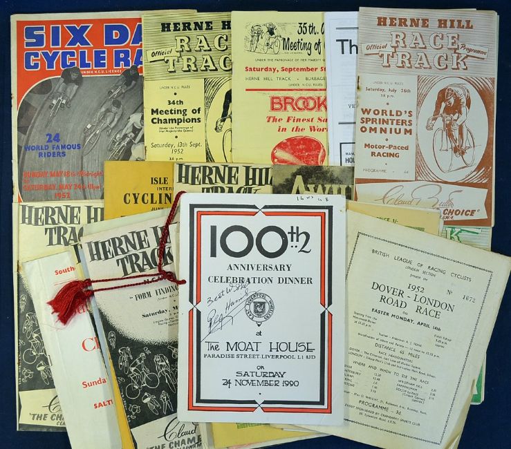 Assorted collection of Cycling programmes from the early 1950s onwards consisting of signed Reg Harris 100th Anniversary Dinner Menu of East Liverpool Wheelers, Six Day Cycle Race 24 World Famous Riders at Wembley 18-24/05/52, British League of Racing Cyclists 14/04/52, World’s Sprinters Omnium at Herne Hill 26/07c.1950, Amateur Sprint Championship of Gt Britain at Herne Hill 05/07/c1950, 34th Meeting of Champions at Herne Hill 13/09/52, 35th Meeting of Champions at Herne Hill 05/09/53, 36th Meeting of Champions 04/09/54 and many other cycling clubs to include Tooting, Charlotteville CC, The Marlboro Athletic Club, Southern Counties CU all in varying condition A/G, quantity (30)