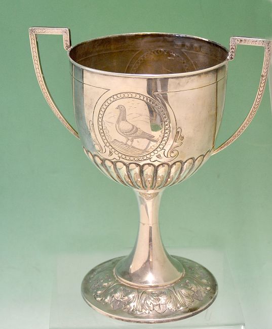 Fine 1896 Pigeon silver trophy – silver hallmarked Birmingham 1896/97, cartouche engraved with a Pigeon in profile, half dragooned bowl, tapered stem and base embossed with acanthus leaves – overall wt 14.3oz
