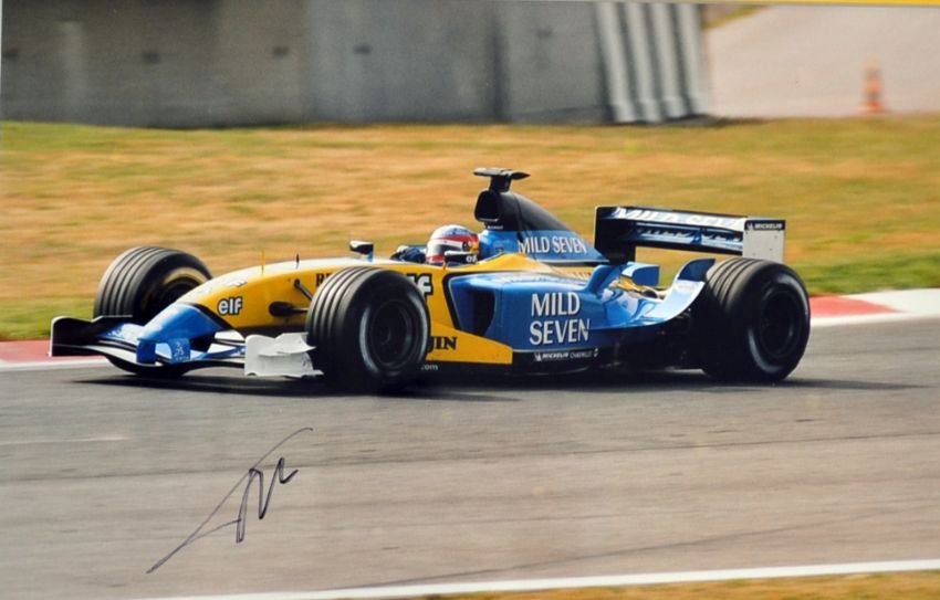 Signed Fernando Alonso Formula One racing photograph driving for Renault 2003-2006, two times Formula One World Champion, mf&g 16” x 12”