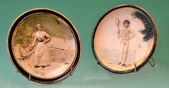 Pair of Vic tennis coloured wall plates – moulded in relief with a male and female tennis player both standing in front of diamond tennis net – bases both stamped with production nos 7480 and G538 – overall 6.75” dia – minor wear/chip to the underneath rim