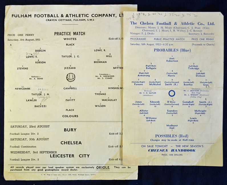 1952/1953 Public practice matches Fulham – Whites v Colours dated 16 August 1952, single sheet issue. Chelsea – Probables v Possibles dated 16 August 1952, single sheet issue (2)
