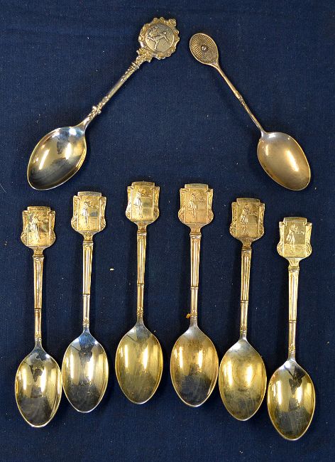 Collection of tennis silver and silver plated teaspoons to incl set of 6 EPNS teaspoons with lady tennis players in relief to the finials, another silver plated ladies doubles players in relief to the finial and another fitted with a tennis racket handle (8)