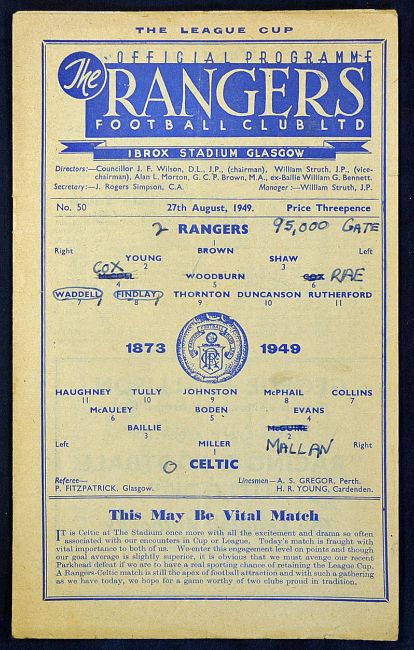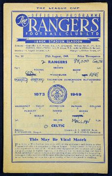 Scottish football programme 49/50 Rangers v Celtic (SLC) dated 27 August. Fold, sl.crease, team changes & score