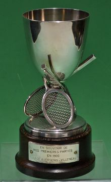 1900 French Lilly Tennis Club fine silver-plated tennis trophy with three mesh-strung lawn tennis rackets stem c/w a wooden circular base mounted with two engraved silver plated plaques - the 1st reads, “En Souvenir de mes Premieres Parties en 1900 - Louise Aversenq-Villeneau” (In Remembrance of my First Parties in 1900 - Louise Aversenq-Villeneau) – the 2nd plaque reads “Coupe Lilly - Tennis Club de St. Jean D’Angely” - overall 17cm h