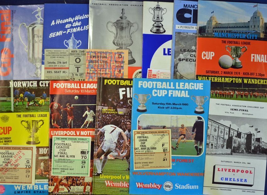 Football programme collection including 1964/65 Liverpool v Chelsea (FAC S/F), 1967/68 Everton v Leeds Utd (FAC S/F) + ticket, 1973/74 Liverpool v Leicester City (FAC S/F + ticket, 1973/74 Manchester City v Plymouth Argyle (FLC S/F), 1973 F.L. Cup Final + ticket, 1974 F.L. Cup Final, 1978 F.L. Cup Final + ticket, 1980 F.L. Cup Final + ticket, 1981 F. L. Cup Final x 2 + 1 ticket, 1983 F.L. Cup Final G-VG (19)