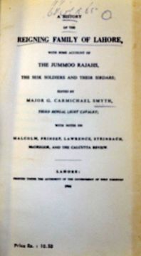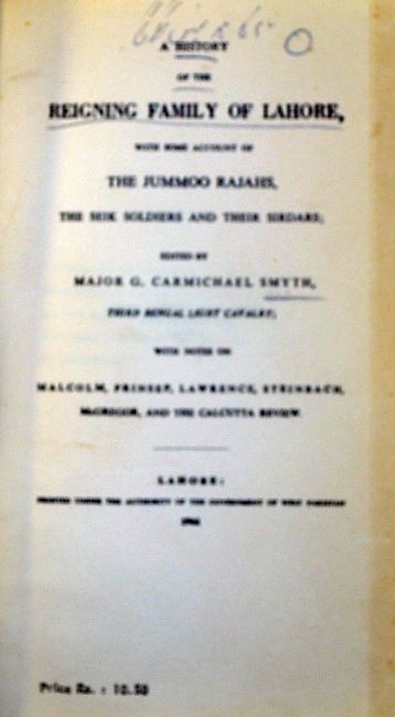 India Sikh History of the Reigning Family of Lahore Book published 1961 with Some Account of the Jummoo Rajahs, the Seik Soldiers and Their Sirdars, with notes on Malcolm, Prinsep, Lawrence, Steinbach, McGregor, and the Calcutta Review by Major G Carmichael Smyth, gilt tooling, fine leather binding, 279 pages. Ownership details inside cover, numerous illustrations, includes Map of Lahore, Includes chapters: Runjeet Singh's family, early history of Ranjit Singh, secret history of the Lahiore durbar, The siege of Lahore by Shere Singh, Phooola Singh the Akalee and much more, in good clean condition