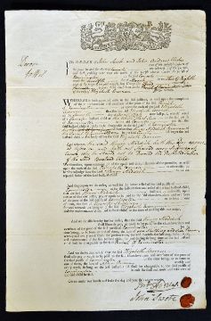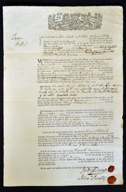 1798 Bastardy Payment Order made by John Andrews & John Swete J.P. against Henry Maddick yeoman of Exminster, Devon dated 12th March for begetting a female bastard child upon the body of Elizabeth Warren so that it will not become a charge on the Parish. Elizabeth was delivered of the child at the White Hart Inn and Henry is charged with paying 20 shillings for the laying-in and a weekly sum of 1 shilling and 6 pence for as long as the child shall be chargeable to the Parish. Royal Arms and black printing with manuscript annotations and signatures, single sheet with light fold marks and tears to edges and in good clean condition overall size 20cm x 30cm