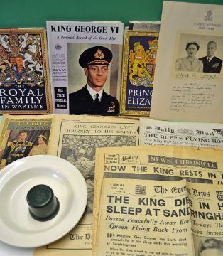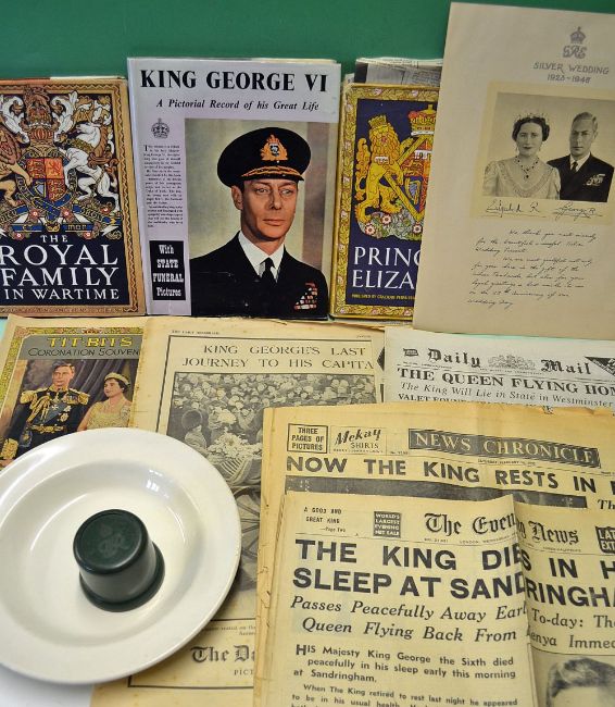 Royalty Selection of 1937 onwards King George VI Ephemera consisting of an interesting porcelain bowl with 'GVIR Empire 1942' stamped to bottom and plastic beaker with GVIR cypher believed to have been used to shave, a 'King George VI A Pictorial Record of his great Life' Book with DJ, 1947'Princess Elizabeth' Illustrated story Book by Dermot Morrah, 1945 'The Royal Family In Wartime' illustrated story Book with DJ, 1937 Tit-Bits Coronation Souvenir programme, 24/01/1936 The Daily Telegraph Newspaper ' King George's Last Journey to His Capital' pictorial supplement, 3 x 1952 Newspaper relating to the Death of King George VI, and a 1923-1948 Silver Wedding Print thank you letter for gifts measuring 25.5cm x 34cm, most in good clean condition (11) Note: These items were obtained from a member of the household staff who previously worked at Windsor Castle