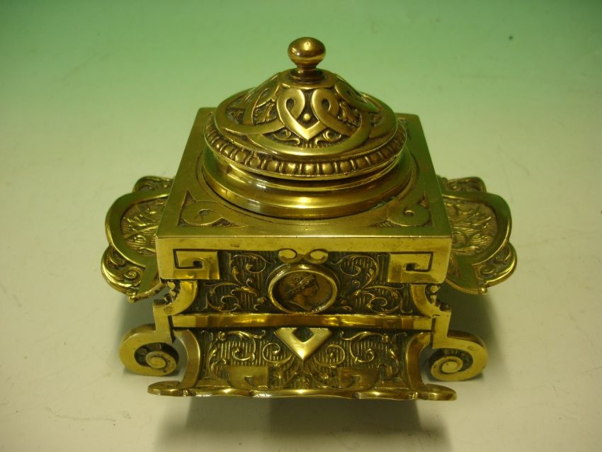Brass Inkwell decorated with repousse scrolls and classical portrait medallions. 19th century. 5 ½" wide