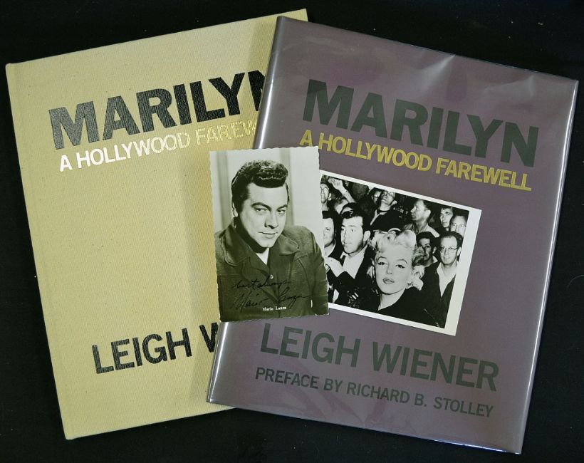 Rare Signed 'Marilyn A Hollywood Farewell' Book by Leigh Wiener and Richard B. Stolley, first Edition 1990, limited edition to 275 copies with printed prospectus, HB, with DJ, this book has been signed by both Wiener and Stolley. Wiener died during within the period of signing the limited edition copies, included in this edition is also a dedicated message from the editor of the book Phil Syracopoulos and a signed postcard of Hollywood actor Mario Lanza, in VG condition a real collector's item