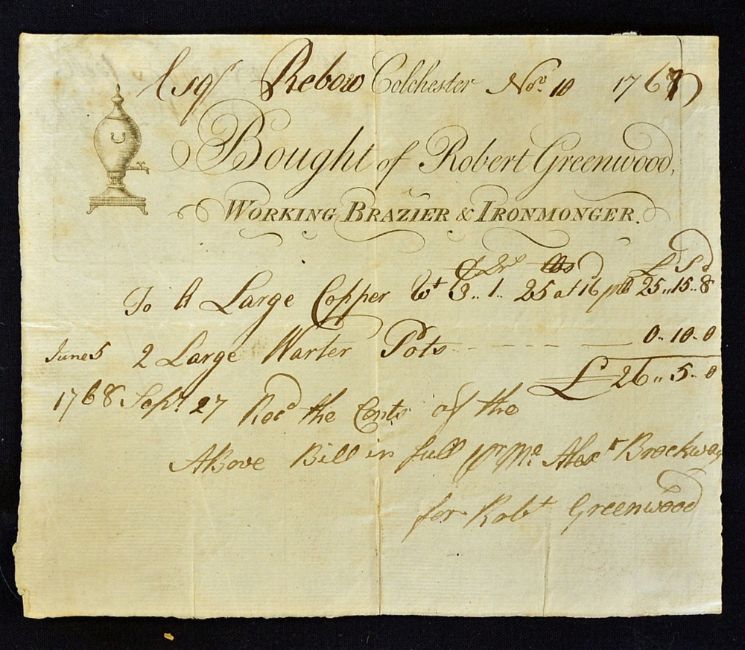 Interesting 1768 Printed Bill bought by a Robert Greenwood, Working Brazier & Ironmonger, Colchester dated to the rear 27th September, containing a Vignette of Water Filter to the front left, a Bill for A large Copper and 2 large water Pots for £26.5s.0d. Black printing with manuscript annotations, overall size 19cm 16cm with some folds across single page, print very clear and overall A/G. Note: one of the earliest printed bills with vignette from a provincial town