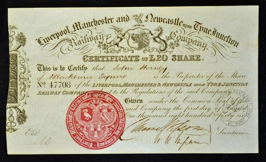 1846 Liverpool, Manchester & Newcastle Upon Tyne Junction Railway Company Certificate for Twenty shares to John Hornby containing a Coat of Arms to the top centre and large coloured seal in an attractive black and red print and in good clean condition 23 x 13cm