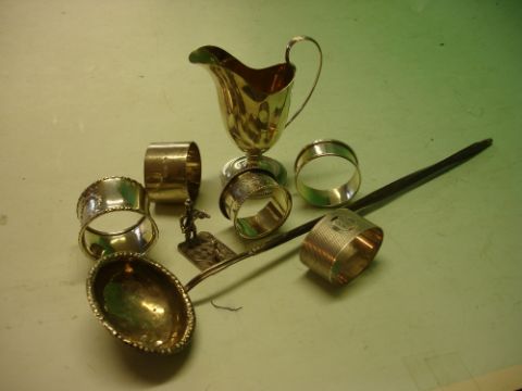 Miscellaneous Silver Viz. A cream jug, five napkin rings, a toddy ladle and a menu holder. 5ozs 15dwts