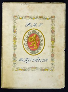 R.M.S. Aquitania Publication Cunard's Largest 4 Funnel Liner being 46,000 Tons, c1920s featuring an impressive large 28 page quality publication with view of this 4 funnel ocean liner. Plus 24 photographs of the magnificent state rooms and the interior of the ship. Printed on fine gloss paper and in pictorial art nouveau card cover, minor foxing to cover, pages are clean