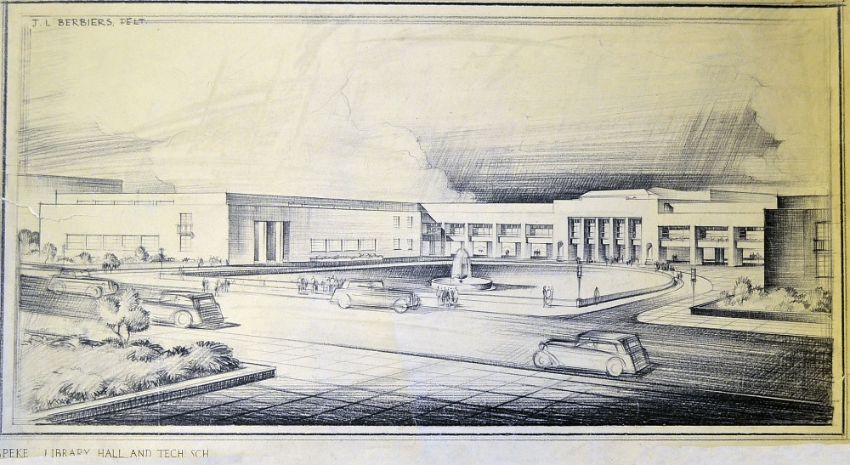 Artists Impressions c1940s Bandstand and Open Air theatre and Library Hall and Technical School hand drawn illustrations depicting stunning concepts of the front exterior in charcoal and signed by award winning architect J L Berbiers, with slight damages to the edges but otherwise clear and ideal for framing, measuring 70 x 40cm (2)
