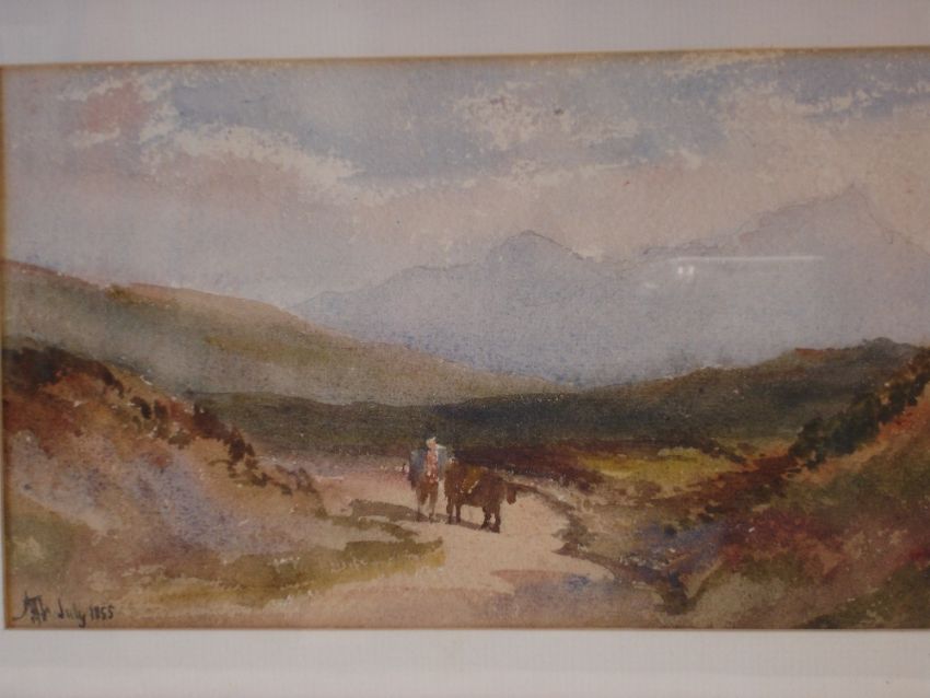 English School, 19th Century. Highland landscapes with figures on a path. A pair. Both signed with monogram and dated 1855. Watercolour on paper 6"x 10"