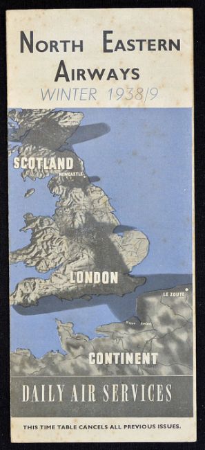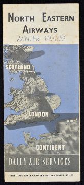 1938/9 Winter North Eastern Airways Time Table a fold out 8 page time table, with fares and details from London Croydon to Leeds, Newcastle and Scotland, minor foxing otherwise clean example, folds out to 38cm × 22cm