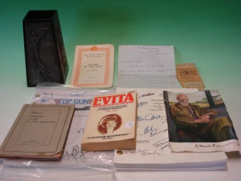 Theatre Memorabilia. Collection comprising a paperback volume "Evita" signed by Tim Rice and Andrew Lloyd Weber; a letter from Shakespeare doyenne Brenda Bruce; a signed 1951 Haymarket Theatre programme "Waters of the Moon"; a volume "Mary Stewart" signed by the author John Drinkwater; a portrait print of George Bernard Shaw bearing a signature; two film scripts, "Top Gun" and "The Godfather" both with facsimile signatures and other miscellany