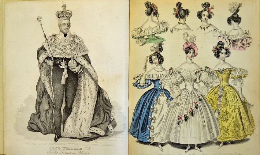 Bell's New Court Journal bound volume of editions from March 15th to May 3rd 1834, modern binding, but featuring a group of seven very good hand coloured plates showing court fashions of the time, together with a similar number of black and white engraved plates of leading figures of the time including William IV, Tallyrand and Paganini, clean copy
