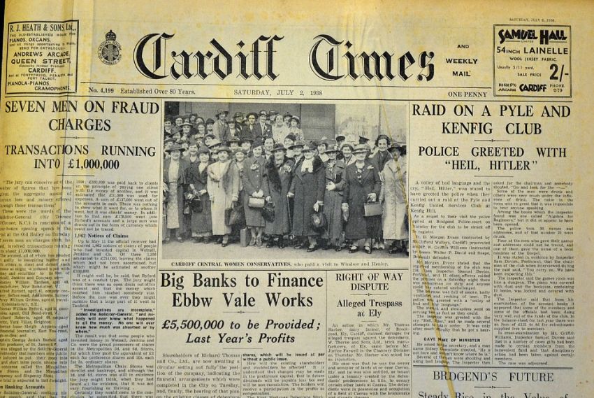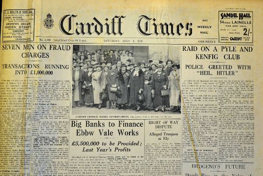 1938 Cardiff Times Chronology dated July-December 321 to the spine, including a bound volume of 26 newspapers starting with 2nd July 1938 complete to 31st December all newspaper complete, with some fold marks and minor tears to some pages otherwise in very good, clean condition, wooden cloth bound boards measuring 44 x 60cm a great source for historical information
