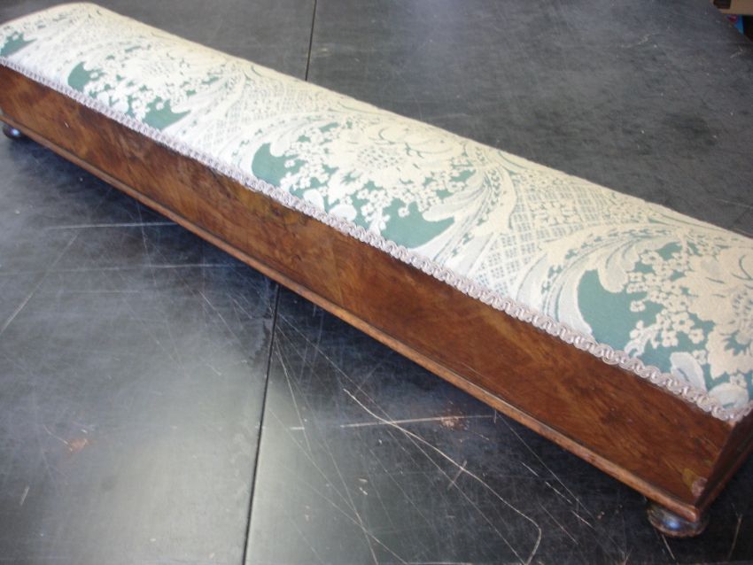 A Victorian Walnut Footstool of sarcophagus form with upholstered top raised on bun feet. 41 ½" long